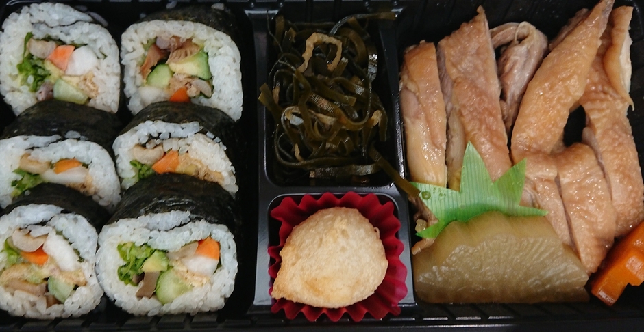 地元野菜を中心とした「野菜太巻き弁当」と、野菜でお寿司を表現した「野菜握り寿司風弁当」の2種類。いずれもアレルギー(特定原材料7品目)に配慮している上に、野菜握り寿司風弁当には動物性食材を一切使用していないので、ベジタリアン、ヴィーガン(純菜食主義)、ハラルなど幅広い食文化の方でも楽しんでいただけます。詳細調味料などについては、掲示してある表示で確認する事ができます。