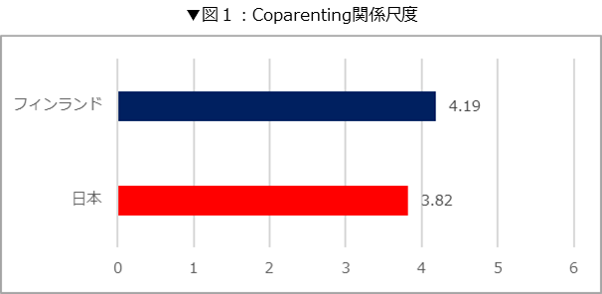 1.夫婦が育児を協同して行っていることを示す「Coparenting関係尺度」のスコアは日本3.82、フィンランド4.19。コミュニケーションに関する項目でフィンランドが日本を大きく上回る結果に。