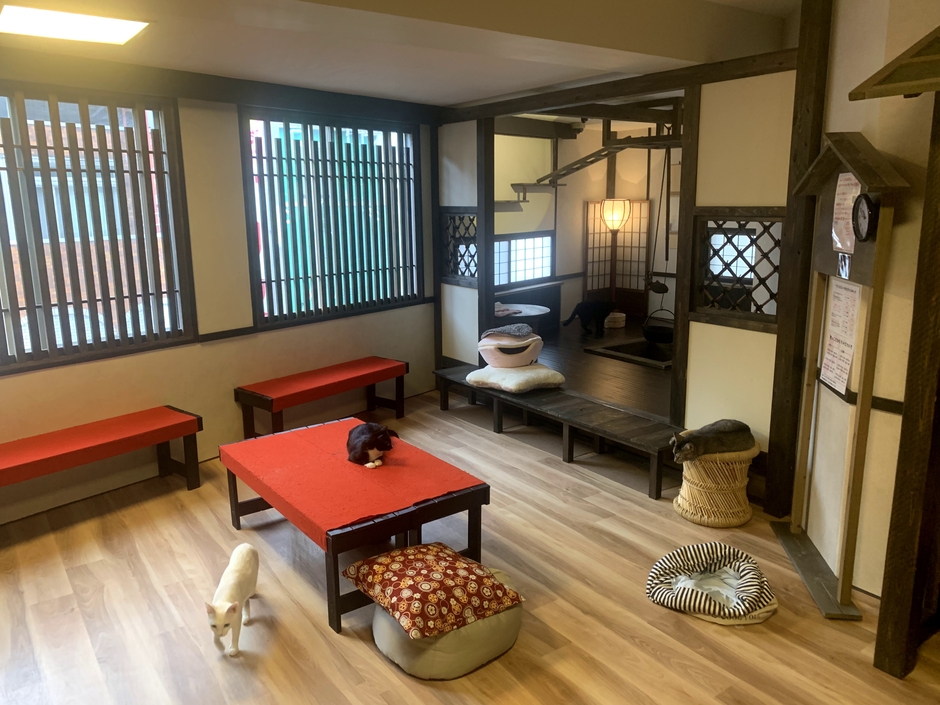 会場の、保護猫カフェ「きゃりこ 武蔵野店」の店内は、和風テイストでまとめられ、落語