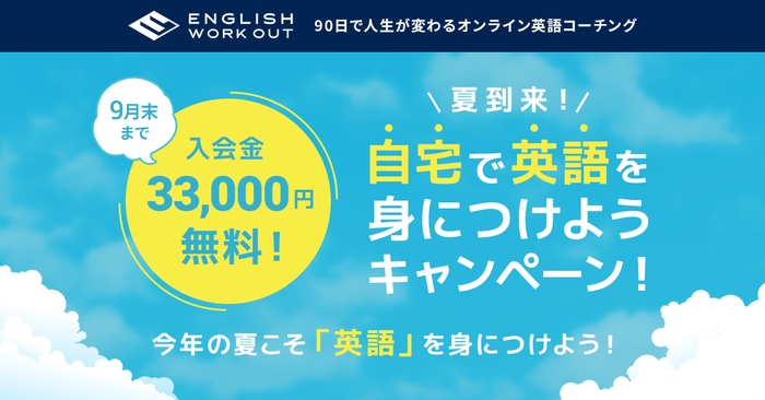 株式会社リードエクスペリエンス(本社:大阪府大阪市、代表取締役:影浦 誠士)は、“ネイティヴの発音の真似や流暢な会話ではなく、言いたい事を確実にアウトプット出来る英語力を!”をコンセプトに当社が企画・運営する英語コーチングサービス「ENGLISH WORKOUT」にて、9月末までのご成約で入会金33,000円が無料となる『夏到来!自宅で英語を身につけようキャンペーン』を開始いたしました。