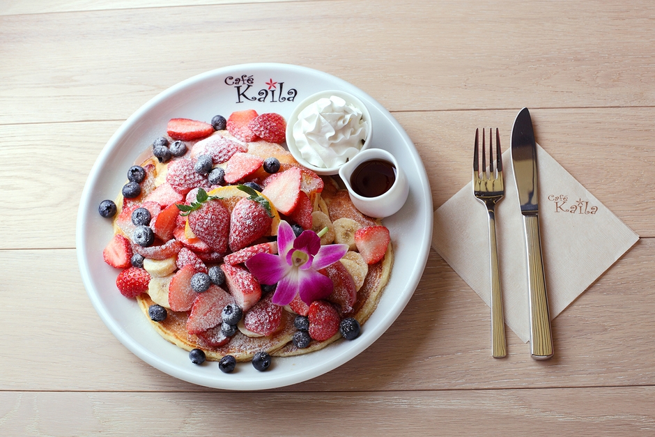 『カフェ・カイラ』の名物は3枚重ねの生地にイチゴ、ブルーベリー、バナナなど新鮮なフルーツをのせた豪華で鮮やかなパンケーキ。フルーツが盛りだくさんの『カフェ・カイラ』は、ハワイロコ(生まれ育った人たち)が行列しても食べたい朝食、として「ハレアイナ賞」を受賞するなど人気を博しています。
