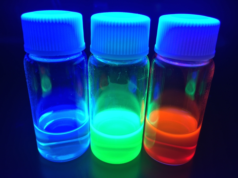 商業ベースとして量子ドットを研究開発、製造している企業は世界でもまだ数が少なく、それらの製品を含め一般的な量子ドットはカドミウムを用いた半導体ですが、多くの用途でこれら重金属の使用は規制されています。そのためカドミウムの含まれていない量子ドットの開発が進められています。冨士色素株式会社はこのカドミウム含有量子ドットを含め、カドミウムを含まない量子ドットとしてZnS、InP/ZnS、CdS、CdSe、CuInS2、CuInSe2、CuInS2/ZnS、PbS、AgInS2などの商品をそろえています。また炭素量子ドット、グラフェン量子ドット、シリコン量子ドットなど量子ドットに関しては新規事業としてかなり注力しております。また、各種量子ドットの受託合成も行っています。一方で、CdSe/ZnSやInP/ZnS量子ドットが主に海外でディスプレイ用途に少しずつ実用化され始めていますが、Cdの強い毒性、Inの希少性が問題になっています。またInP/ZnSにおいてはO2やH2Oを完全に遮断した環境下での合成が必要とされ、InPの化学的安定性、耐久性などの課題がまだ残っています。このような観点から弊社においてペロブスカイト型量子ドットを作成しました。CH3NH3PbX3(Green)、CsPbX3(X=Cl, Br, I) (Blue, Red)が代表的な組成となっています。量子収率は約50-80%です。半値幅は18nm - 39nmあたりと非常に狭いものができています。発光波長が調整可能で、発光スペクトルの半値幅が狭い特性があるため、有機EL、レーザー、LED、ディスプレイなどの領域で大きな潜在能力があります。ベースとなる溶剤は各種検討中ですが、トルエン、ヘキサンが主となっています。なお鉛(Pb)無しのペロブスカイト型量子ドットは、量子収率の低下や半値幅が大きくなるなど特性が低下しますので現在まだ開発中です。