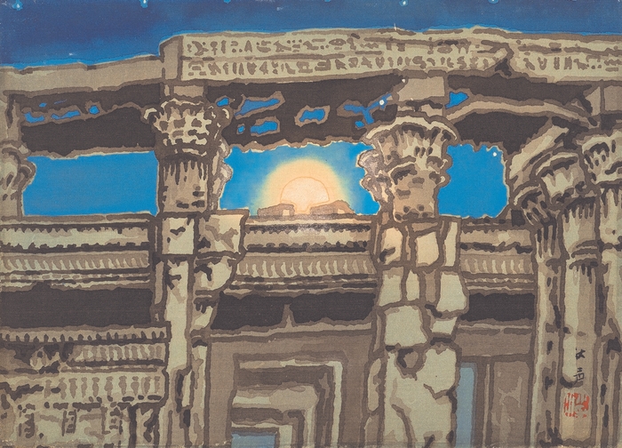 (右)小早川秋聲《エジプト カルナック アイシス宮殿趾の月》1923~24(大正12~13)年頃 個人蔵