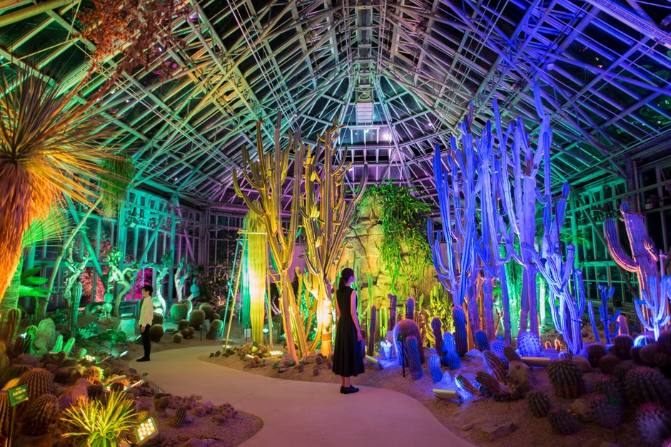 植物館の珍しい植物が光り輝く。植物の光は、それぞれ自律しており、ゆっくりと呼吸するかのように明滅している。