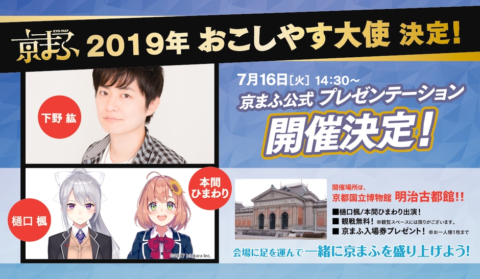 こちらのプレゼンテーションでは、にじさんじの樋口楓・本間ひまわりがゲストとして会場を盛りあげ、京まふ2019の出展者や出展作品、京まふステージ及びオープンステージのプログラム、様々なイベント企画などを発表します。また下野紘よりのメッセージコメントもお届けします。