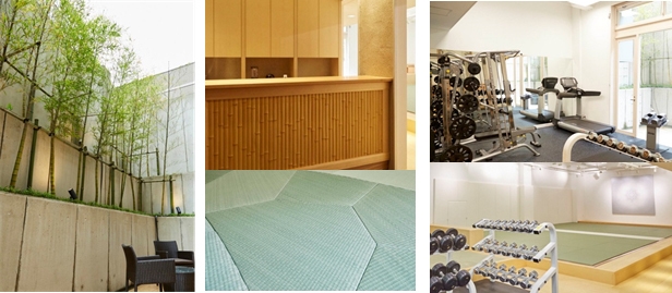 (左)竹を使った和の外観、(中)木や畳を取り入れた空間づくり、(右)道場のようなトレーニング空間