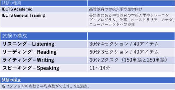 IELTSには、AcademicとGeneral Trainingの2種類の試験があり、一般的にはそれぞれ以下の目的に用いられ試験内容も異なります。