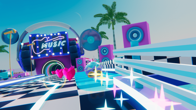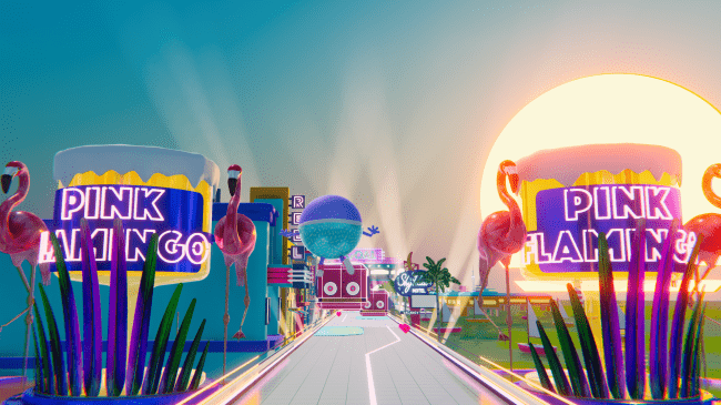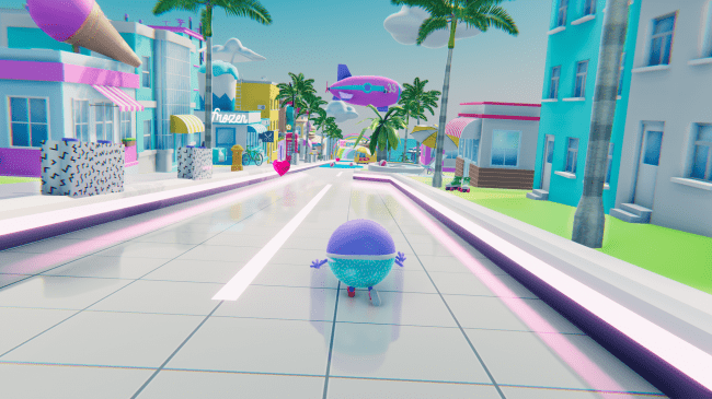 ボールのように丸いキャラクターが、デートの待ち合わせ場所に向かうため80年代風の仮想空間の街並みを走ったり転がったりしながら進んでいきます。