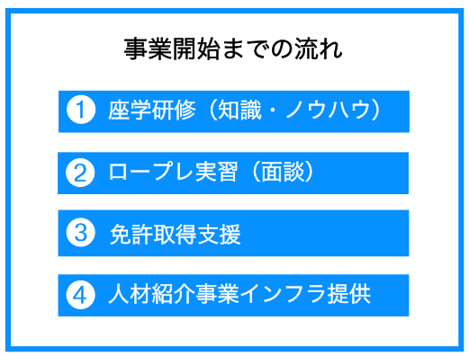 また、求人企業の開拓支援だけでなく、各種業務フォローなど、グルーヴスの人材紹介事業サポート部員が継続的な支援を行います。このため最短での人材紹介事業の開始が可能となります。