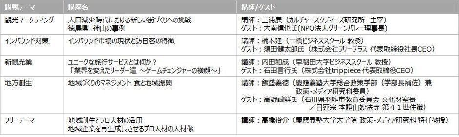 ・講義テーマ:「観光マーケティング」、「インバウンド対策」、「新観光業」、「地方創生」、「フリーテーマ」