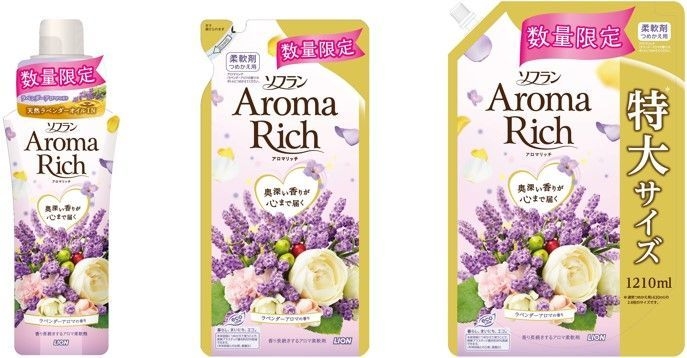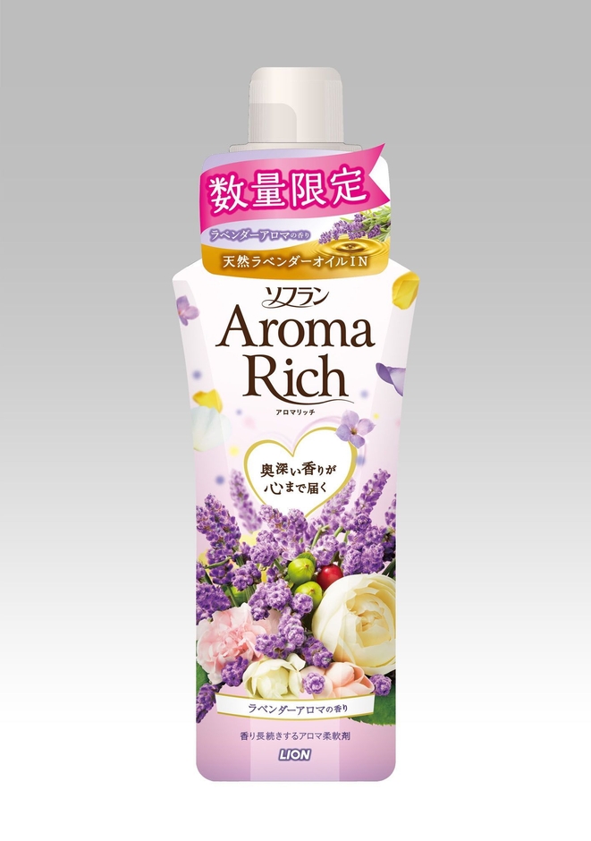 そこで、『ソフラン アロマリッチ』は、現代女性に寄り添うブランドとして、新年度からの生活環境の変化や季節的背景により気持ちの変化や乱れが起こりやすいと言われている、春から初夏の時期に着目し、心地よく安らぎを感じつつ前向きな気分になるイメージの『ラベンダーアロマの香り』を数量限定で発売いたします。
