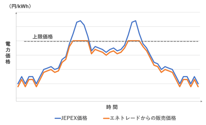 エネトレードが、JEPX価格に連動した価格にて電力を販売いたします。この時、設定した上限価格(キャップ)を超えた時間帯ではJEPX価格を下回る上限価格での販売を行います。デリバティブ取引における「コールオプション」を応用したサービスで、これにより急なJEPXの価格高騰のリスクを軽減することができます。