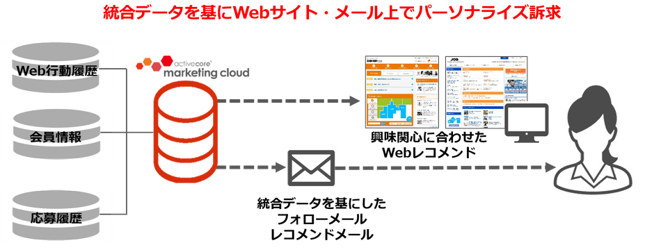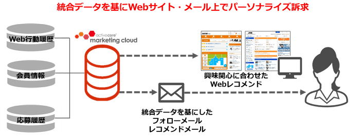 そこで、求職者の登録情報はもちろん、Webサイトの行動履歴から興味関心を推測し、求職者一人ひとりにパーソナライズしたメールやレコメンドによるコミュニケーションを図ることができる、「activecore marketing cloud」の導入を決意しました。