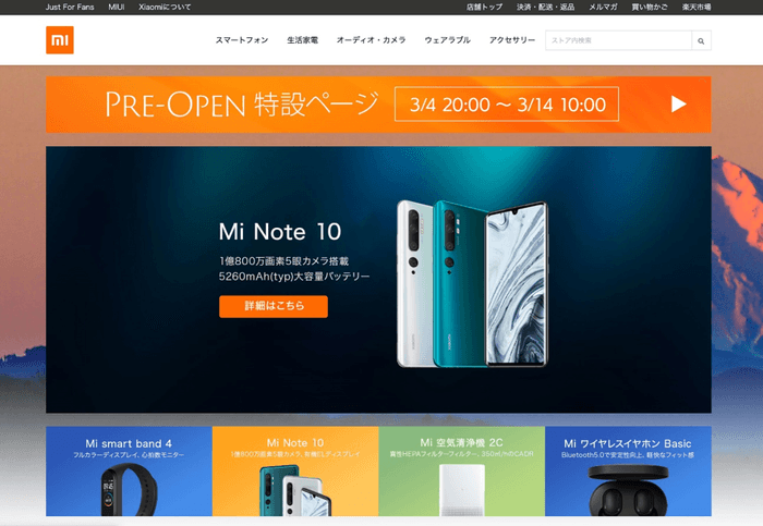 2020年3月4日(水)より、楽天市場に「Xiaomi楽天オフィシャルストア」がオープンし、世界ブランドXiaomiのスマートフォン「Mi Note 10」をはじめ、Xiaomi製の生活家電やオーディオ・カメラなどの取り扱いを開始しました。運営業務を行うのは、株式会社DreamWorks。