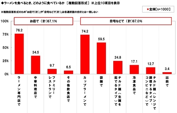 ラーメンとチャーハンのいずれも食べることがある、全国の20歳~59歳の男女1,000名(全回答者)に、ラーメンを食べるとき、どのように食べているかを聞いたところ、「ラーメン専門店で」が最も多く76.2%、次いで、「カップラーメンで」が74.2%、「袋麺で」が59.5%、「中華料理店で」が34.5%、「チルド麺(生麺を茹でるタイプ)で」が24.8%、「冷凍食品で」が17.1%で続きました。ラーメンの食べ方について、『お店で』と『自宅などで』の2つにわけてみると、『お店で』は87.1%、『自宅などで』は87.0%となり、自宅などで自分で作って食べている人も多いことがわかりました。