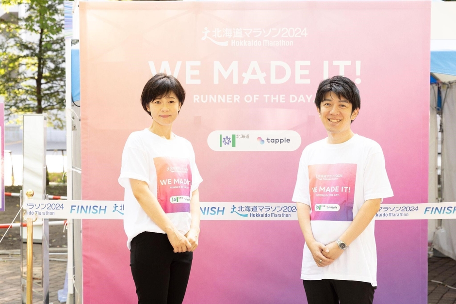 北海道マラソン2024にて、北海道と株式会社タップルが共同ブースを出展しました。今年3月に締結された「出会い・結婚支援に関する連携協定」によるものです。自治体とマッチングアプリの企業が協力した事例であり、地域の若者が集まるイベントにコラボブースを出展するという珍しい機会になりました。
