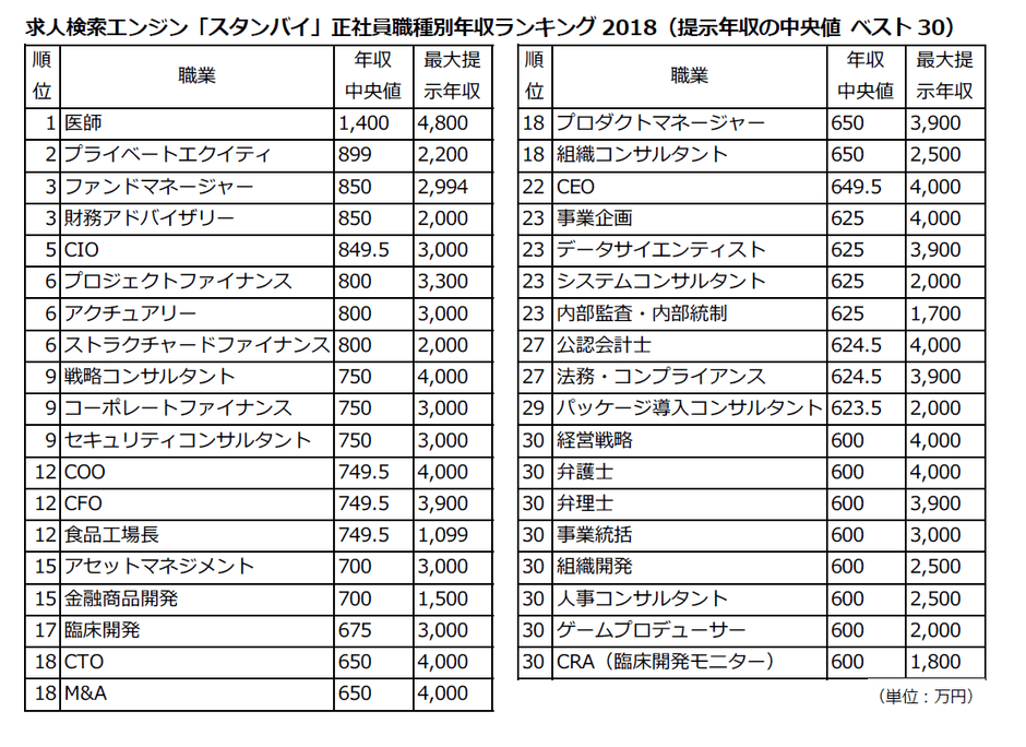 職種別年収中央値ランキング発表 1位:医師1,400万円、2位:プライベートエクイティ、3位:ファンドマネージャー/財務アドバイザリー(求人検索エンジン「スタンバイ」調べ)