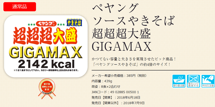 昨年、発売し日本食糧新聞社制定の優秀ヒット賞も受賞した『ペヤングソースやきそば超超超大盛GIGAMAX』の約365倍サイズ(※1)となり、総カロリーは781830kcalと成人男性の一日の摂取基準(おおよそ1,500kcal~2,500kcal(※2))を圧倒的に上回ります。