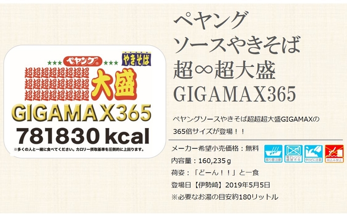 お腹いっぱい食べたい願いを叶えます! 『総カロリー781830kcal』ペヤングソース焼きそば 超∞超大盛GIGAMAX365登場のお知らせ