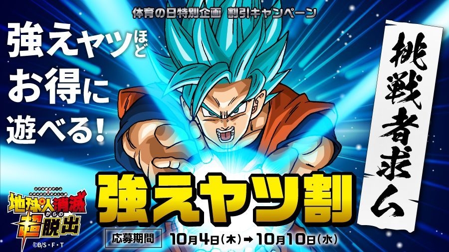 株式会社SCRAP(本社:東京都渋谷区 代表:加藤隆生)が企画運営を行っている「リアル脱出ゲーム」と「ドラゴンボール超(スーパー)」とのコラボレーションイベント『地球人消滅からの超脱出』にて、大好評につき、体育の日特別企画「強えヤツ割 キャンペーン!」を10月4日(木)~ 10月10日(水)の期間限定で実施いたします。