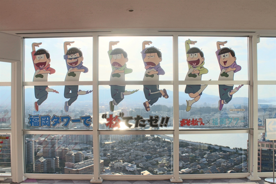 福岡タワー(福岡市早良区)では、2019年12月14日(土)から2020年1月19日(日)まで、大人気TVアニメ「おそ松さん」とのコラボレーションイベントを開催しています。期間中は、おそ松さんの6つ子が展望室に窓シートとなって登場するほか、福岡ゆかりの格好をした6つ子の等身大パネルも登場し、ここでしか見られない様々なコラボレーション企画を実施中です。
