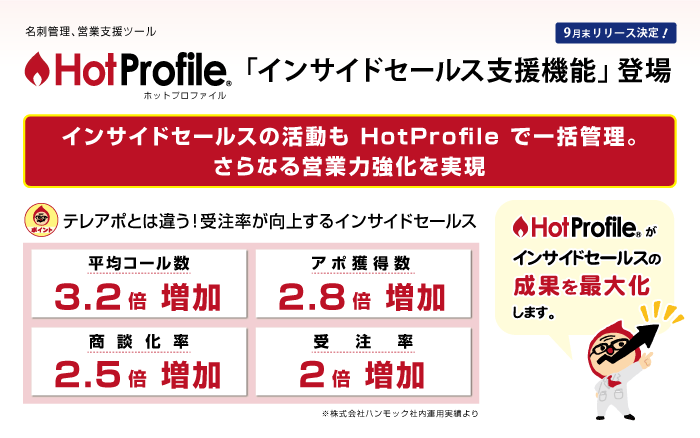 株式会社ハンモック(本社:東京都新宿区、代表取締役社長:若山 大典、以下 ハンモック)は、名刺管理、営業支援ツール「HotProfile(ホットプロファイル)」のインサイドセールスオプションを2018年9月末にリリースすることを発表いたします。