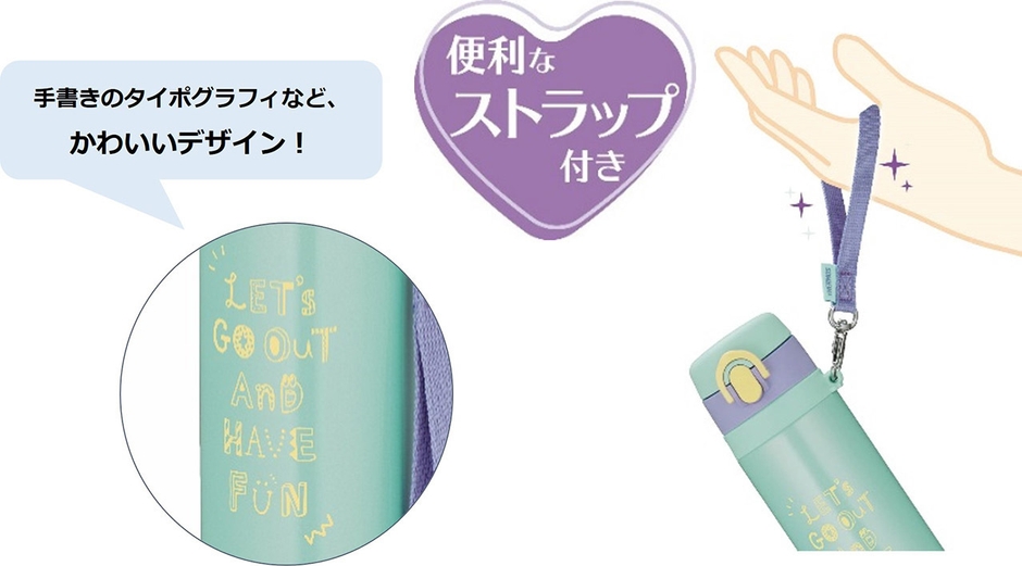 本製品はボトル本体にカラフルな柄やキュートなイラストをデザインしたケータイマグです。「ハンドストラップ付きで持ち運びやすい」「デザインがかわいい」「スリムなのでランドセルにいれやすい」と、女の子のお子さまに人気の製品です。