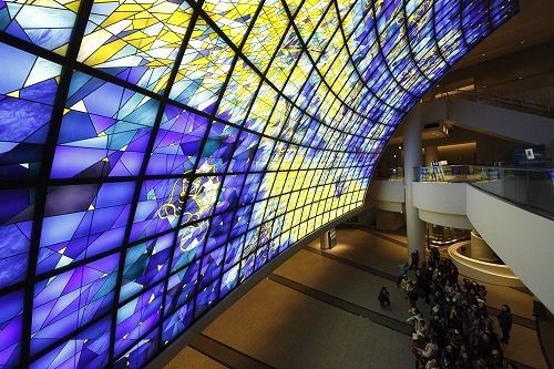 パシフィコ横浜 国立大ホールのエントランスを飾るステンドグラス「星座'94横浜」は幅13~19m、高さ14mの大きさを誇り、宇宙の無限の広がり、奥行きを観るものに感じさせます。