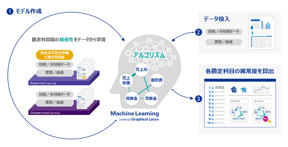 本特許技術では、Graphical Lasso*と呼ばれる手法を用いて、勘定科目間の関係性をデータから学習することで構築したモデルに、検証対象会社の会計情報をインプットし、各勘定科目の異常度を算出しています。本モデルは、(1)過去の不正の有無に関する情報を与えることで学習を行うSupervised Learning、(2)同情報を与えずに学習を行うUnsupervised Learningの二つの手法を含んだハイブリット構造を採用しており、過去に事例数が少ない不正会計であっても検知が可能です。