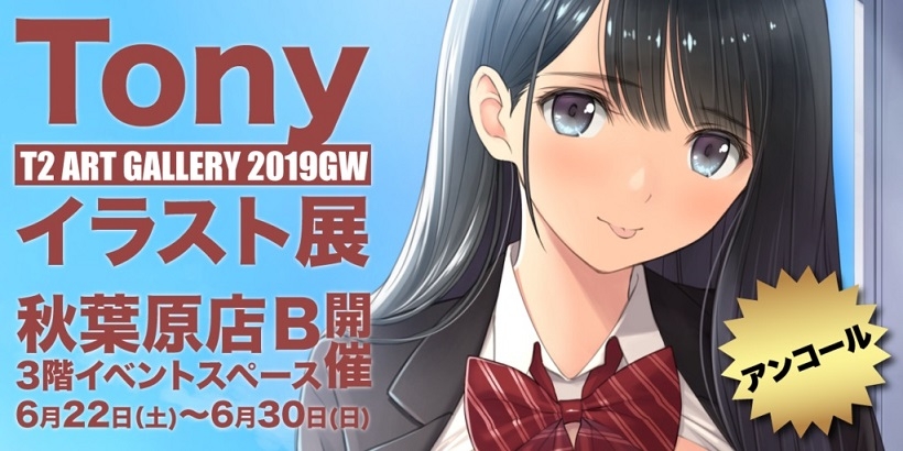 また2019年6月22日(土)からは、2019年のゴールデンウィークに開催し好評を博した、人気絵師Tony先生のイラスト展「T2 ART GALLERY 2019GW」もアンコール開催いたします。この機会にぜひ、お立ち寄りください。