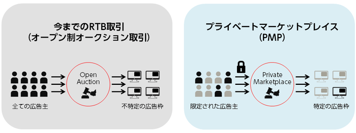 PMPとは、限定された広告主が、媒体社の保有する付加価値の高いプレミアムな広告枠をRTB形式(※1)で優先的に買い付けることができる取引手法の1つです。媒体社も、プレミアムな広告枠を限られた広告主に提供することにより、メディアのブランドを毀損することなく、広告枠の新たな取引手段を活用することが可能です。
