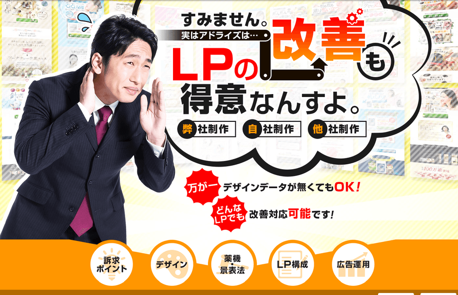 アドライズで制作したLPにはそれはもうたくさんのノウハウが詰まっています。ですから、アドライズ以外で制作されたLPを私たちが見れば、ノウハウ詰め放題、伸びしろが非常に大きい状態だと言えます。アドライズ制作のものでなくても大丈夫。安心してお任せください。