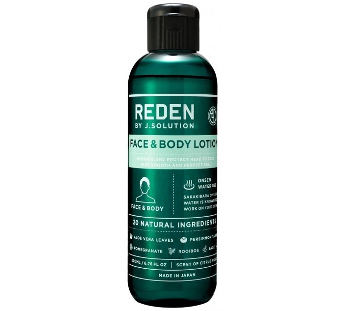 「リデン フェイス&ボディローション」は、榊原温泉水と20種類の天然由来成分を配合した頭皮から足先まで使える全身用化粧水です。さっぱりとした使用感でありながら、しっかり保湿し、つるすべ肌へ導きます。(人気のシトラスムスクの香り)