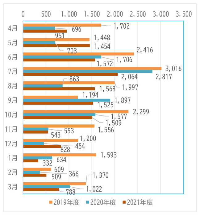 2.忘れ物ランキングでは、傘が最も多く13,643本(2020年度比 約2.7%増)で、忘れ物全体の約22.5%を占めました。1日あたりでは約37本となります。なお、「傘の日(6月11日)」がある6月以降は、傘のお忘れ物が増加傾向にあります。