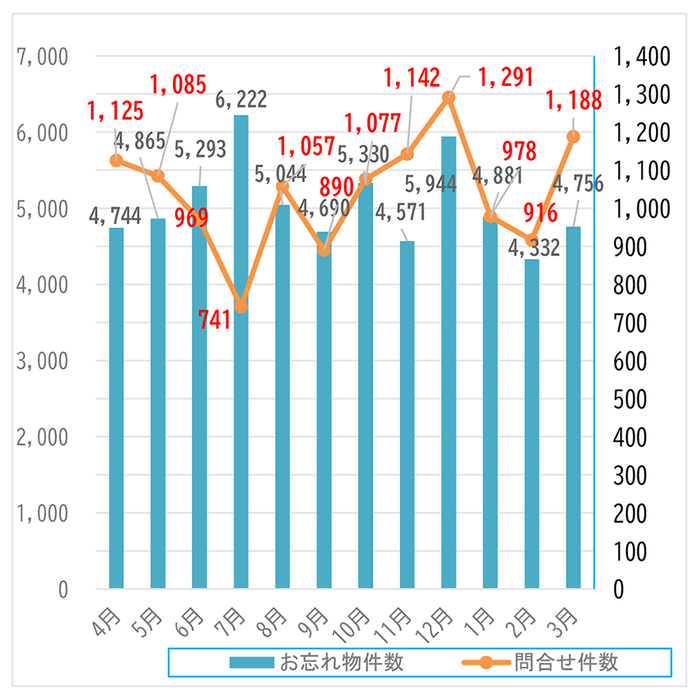■月ごとの忘れ物件数とお問い合わせ件数