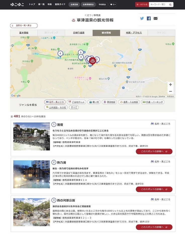 各温泉地周辺の人気の名所・見どころやご当地グルメ、お買い物スポットなど人気ランキング順に掲載。ジャンルごとに絞り込んで検索することも可能です
