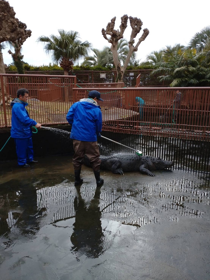 朝7時頃から池の水を抜き始め、開園時間の9時より、池の底や側面の掃除から始め、その後、ワニの背中の汚れを落とすためのブラッシングを開始いたします。
