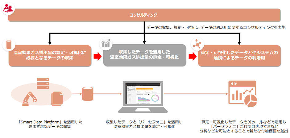 NTT Comは、本サービスにコンサルティングやデータ利活用基盤「Smart Data Platform」などを組み合わせたソリューションを提供し、温室効果ガス排出量の算定・可視化だけでなく、必要となるデータの収集や、算定・可視化されたデータの利活用を実現し、企業のGXに貢献します。