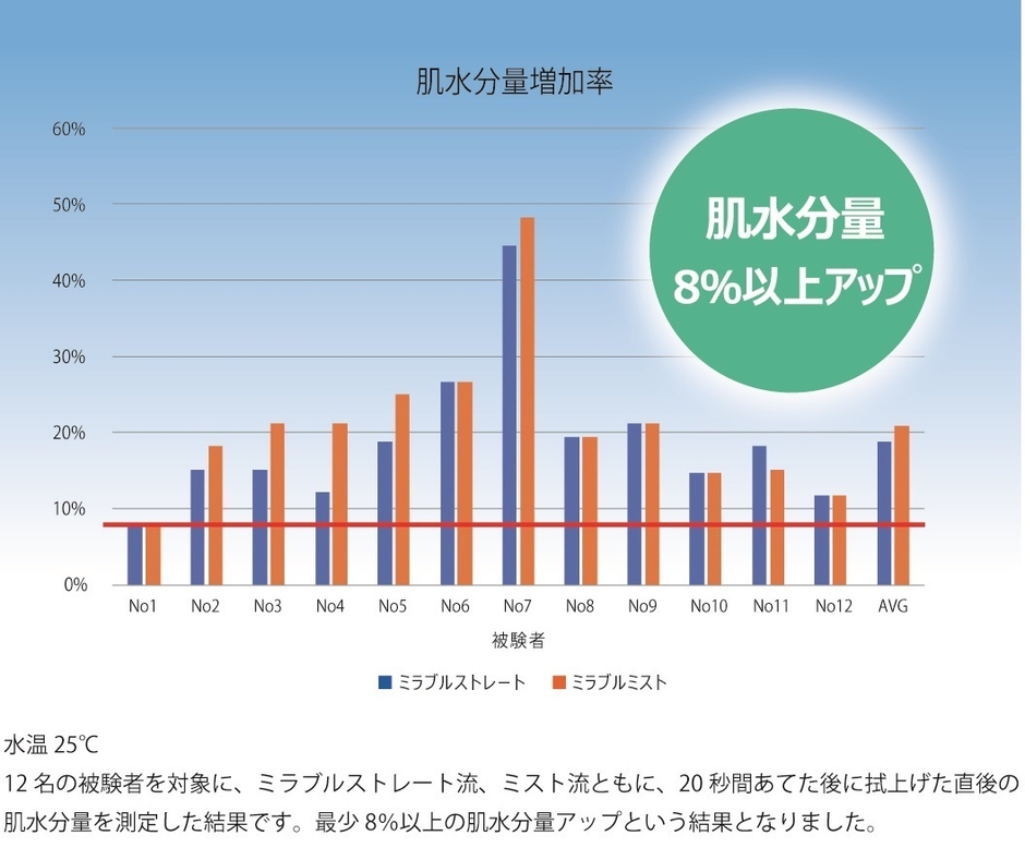 ミラブルシャワーはウルトラファインバブルを含むミスト水流とマイクロバブルを含んだストレート水流をお好みのポジションでご使用いただけます。ミラブルシャワーを使用した後の肌は使用する前よりも水分量がアップ。肌に潤いを与えます。