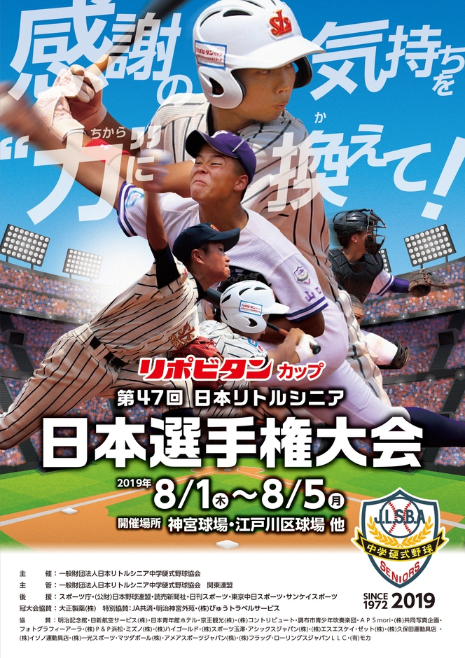 一般財団法人日本リトルシニア中学硬式野球協会(所在地:東京都千代田区、理事長:林清一)は、2019年8月1日(木)~5日(月)に「リポビタンカップ 第47回日本リトルシニア日本選手権大会」を下記の要領で開催いたします。
