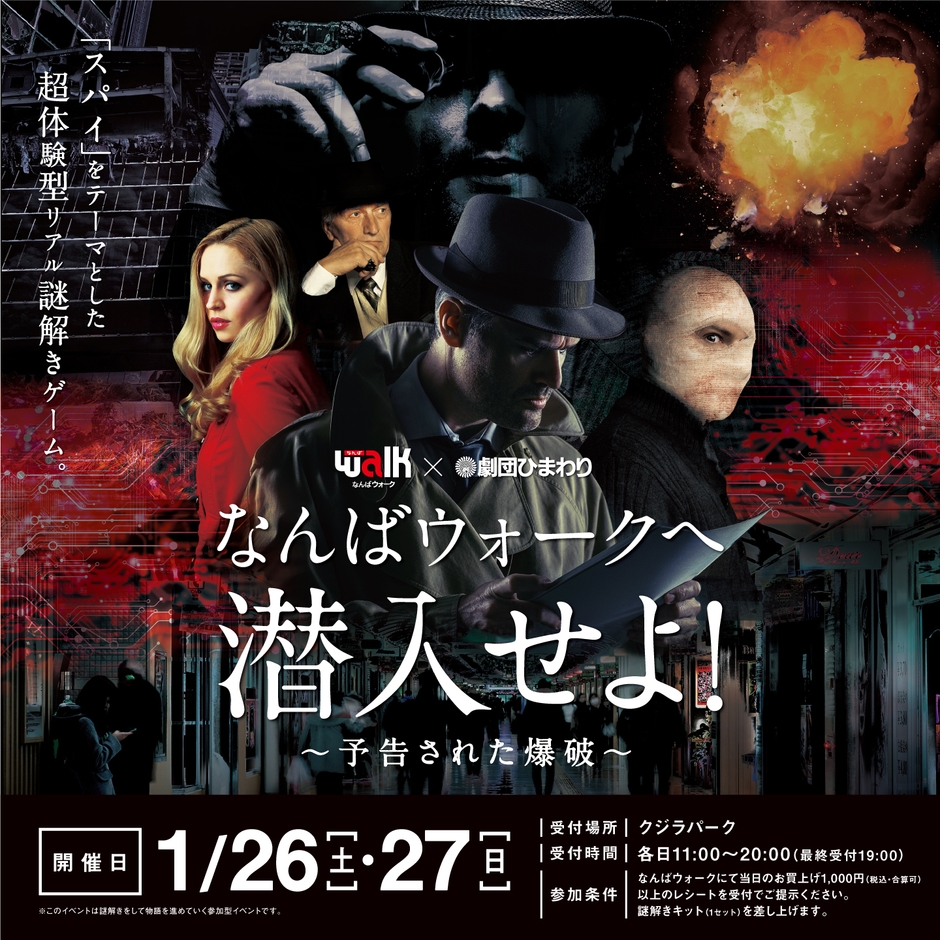 大阪地下街株式会社が運営する「なんばウォーク」(大阪市中央区)は、1月26日(土)から、翌27日(日)の2日間限定で、「なんばウォークへ潜入せよ!~予告された爆破~」(以下、当イベント)と題し、「なんばウォーク館内全域」を舞台に、劇団ひまわりのキャストによる演出も加わり、わくわくドキドキ感満載の体験型謎解きゲームを開催いたします。