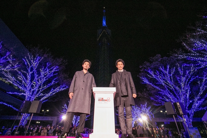 「探偵はBARにいる3」より大泉洋・松田龍平が 福岡タワー・108m巨大クリスマスツリー点灯式に参加