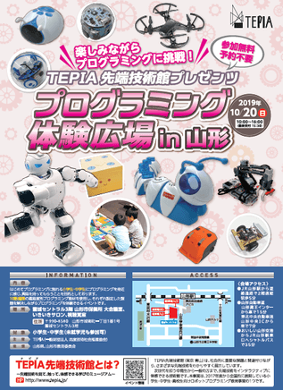TEPIA先端技術館(東京都港区)のアウトリーチ事業「プログラミング体験広場」を一昨年の仙台市をスタートとして昨年は飯塚市、富山市、札幌市で開催してまいりました。今年度の開催地は、東北5県6箇所(福島県いわき市・南相馬市、岩手県盛岡市、秋田県秋田市、山形県山形市、青森県青森市)です。7月のいわき市、盛岡市、9月の福島県南相馬市、10月の秋田市での開催に続き、10/20(日)に山形市 霞城セントラル3階(山形市保健所 大会議室など)にて開催いたします。