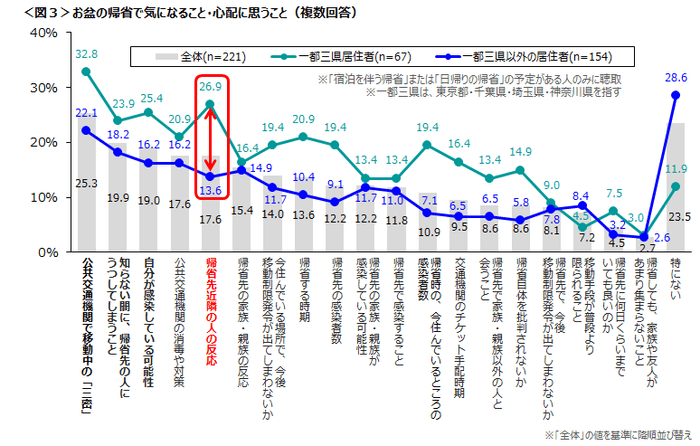 帰省についての最大の心配事は、「公共交通機関で移動中の“三密”」。一都三県居住者では、「帰省先近隣の人の反応」を心配する声が多い。