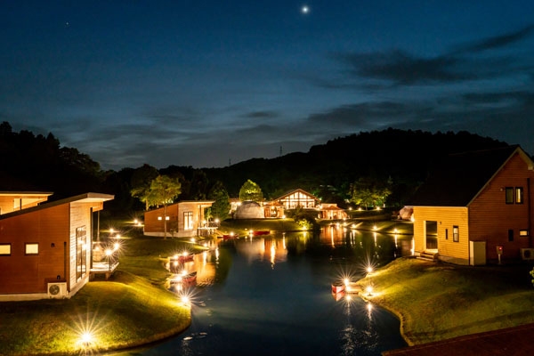 滋賀県米原市池下に2017年6月3日オープンした県内最大級の大型グランピング施設。中央の大きな池でカヌーを楽しめるロケーションも去ることながら、InstagramをはじめとするSNSでも今話題沸騰中の「本格的なグランピング料理」が楽しめます。リゾート感あふれるドリンクを提供するバーテラスやラウンジ「アストラル(メイン棟)」を中心に、池の周りに配した客室棟は全15棟。充分な間隔を置いて点在し、パーソナルな空間づくりに配慮しています。タイプはさまざまで、1階がオープンデッキの2階建てヴィラ、大きな窓から池と伊吹山を望むウッドキャビン。伊吹山側にはロータステントと2018年日本初上陸のレインドロップテント、その対岸にはドームテントが点在し、日暮れからそれぞれの部屋に灯りがともり始めると辺りは幽玄の世界に包まれます。どのタイプのお部屋にも池に専用カヌーをご用意し、お部屋にはウッドデッキがありディナーやモーニングもここにスタンバイ。