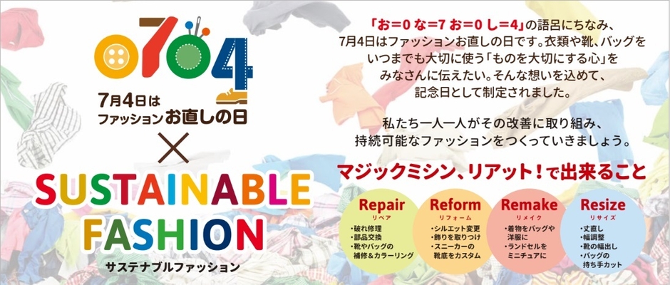 洋服・バッグのお直しを行なう「マジックミシン」、靴・バッグのお直しを行なう「リアット!」など全国に671店舗(2024年2月末現在)を展開する、イオングループのリフォームスタジオ株式会社(以下 当社、本社:千葉県千葉市美浜区、代表取締役社長:亀谷 満)は、7月4日「ファッションお直しの日」(一般社団法人日本記念日協会認定)を記念して、キャンペーンを開催いたします。