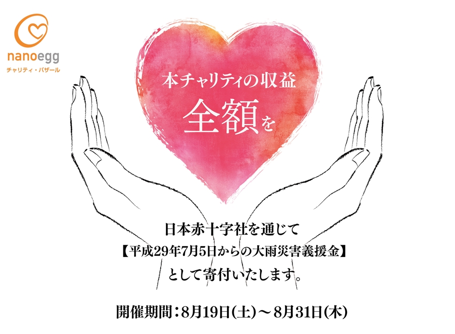 この『ナノエッグ チャリティ・バザール』は、当社の製品の販売から得た収益を、災害や事故などで生活困難に見舞われている方たちのために寄付する活動です。そのスタートとなる、第1回『ナノエッグ チャリティ・バザール』では、8月19日より8月31日まで対象商品全15品を販売し、その収益を全額、本年7月に発生した九州北部豪雨災害の義援金として日本赤十字社を通じて寄付する計画としました。