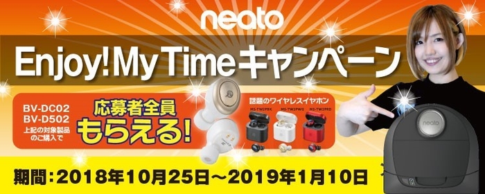 北米でロボット掃除機市場シェア2位の米国を代表するロボット掃除機メーカーNeato Robotics, Inc.(本社:カリフォルニア州シリコンバレー)の日本法人ネイトロボティクス株式会社(本社:東京都港区、代表取締役社長:ホーリングスヘッド・アレン)は、対象機種のご購入で話題の完全ワイヤレスイヤホンなどが応募者全員もらえる「ネイト Enjoy! My Time キャンペーン」を開催すると発表しました。