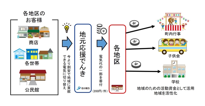 プランの内容としては、大徳地区の各世帯や商店、企業等が石川電力の「大徳応援でんき」に切り替えると、電気料金が割安になり、且つ一件あたり200円/月が地区に寄付される仕組みです。