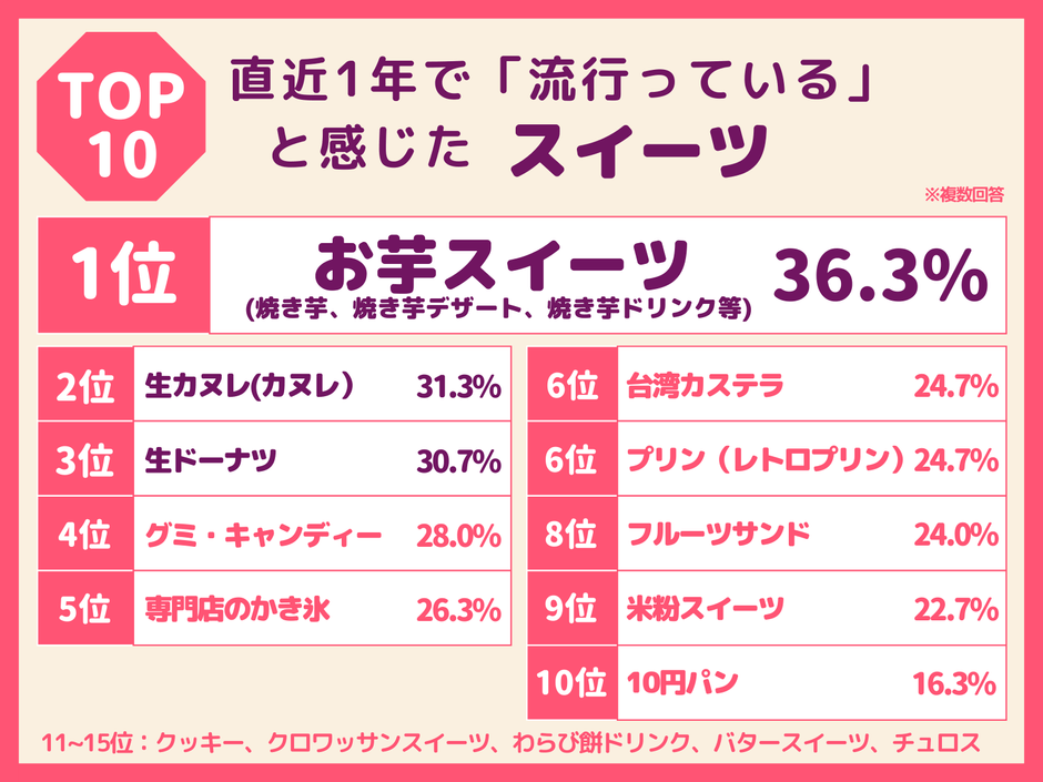1位お芋スイーツ、2位生カヌレ(カヌレ)、3位生ドーナツ、4位グミ・キャンディー、5位専門店のかき氷となった。1位お芋スイーツ、2位生カヌレ(カヌレ)は2023年下半期と変わらずだったが、3位に生ドーナツが急上昇。4位グミ・キャンディー、5位専門店のかき氷と、グミ・キャンディー、かき氷など若年層のトレンドから幅広い年齢層に人気が広がっていることが確認できる。特にかき氷に関しては、調査の時期がやや早かったため5位となったが、夏に向けてこのかき氷トレンドは続くとみられる。さらに10位以下に、クルンジなどのクロワッサンスイーツ、チュロスと韓国発のスイーツもランキングに上がってきている。